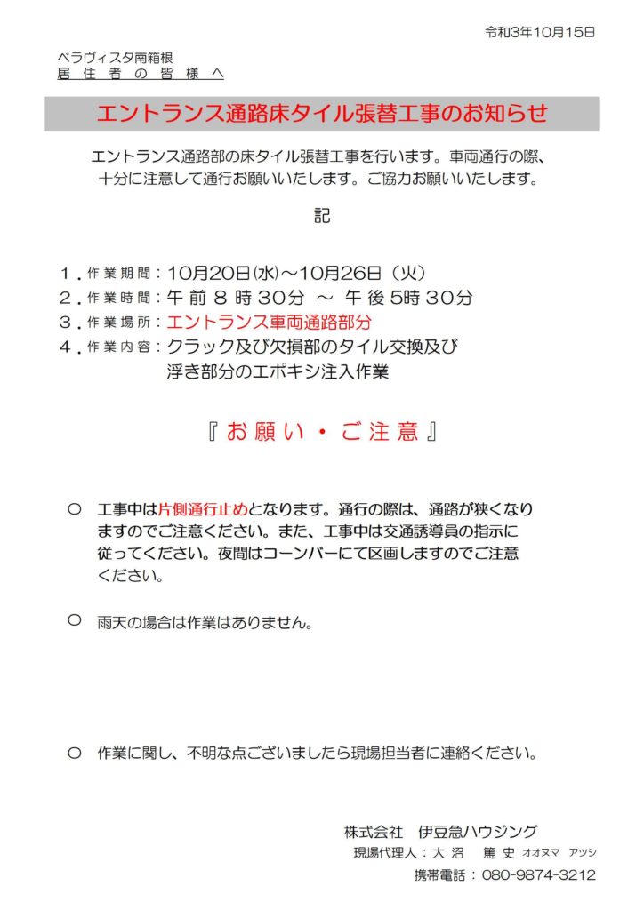 入口通路のタイル張替えのお知らせ