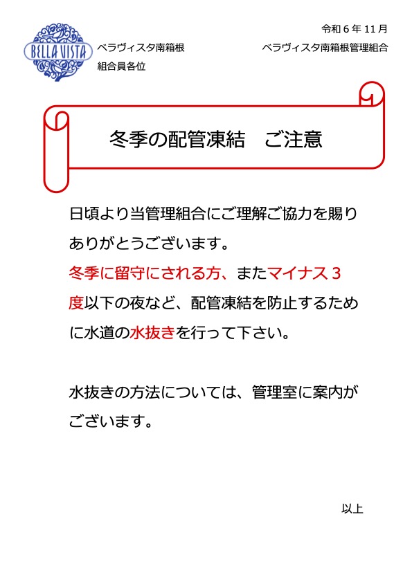 冬季配管凍結に注意してください